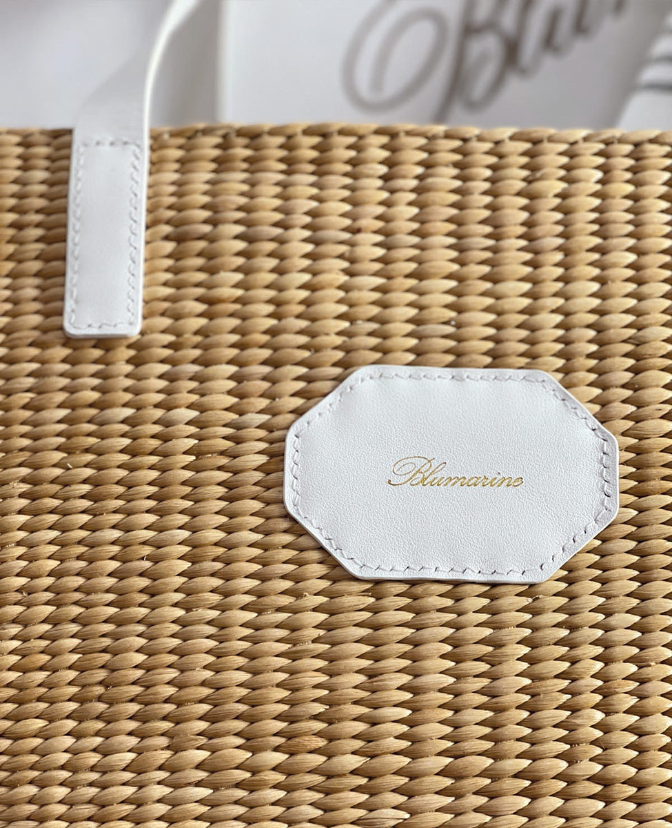 Borsa da mare intrecciata e rifinita in pelle, elegante e raffinata. Presenta un tag con logo Blumarine stampato, che aggiunge un tocco distintivo.