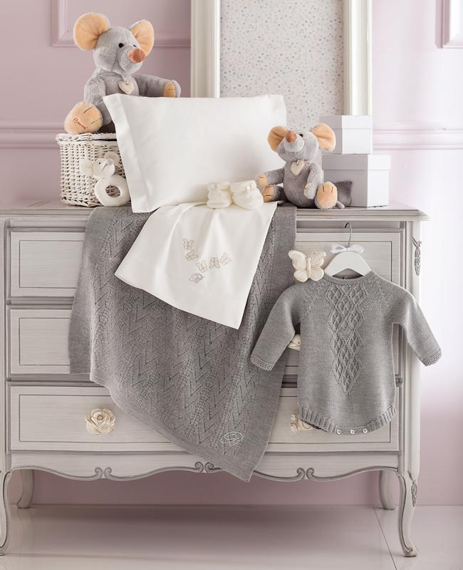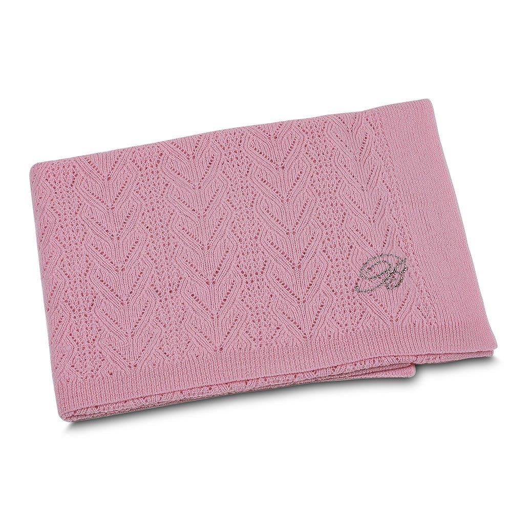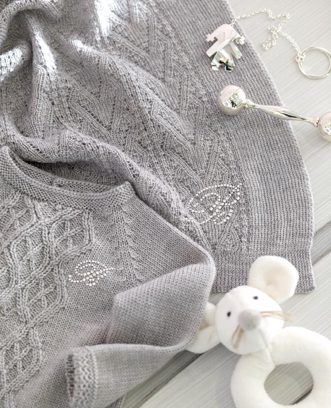 Copertina 100% lana merino per culla e carrozzina con disegno in jacquard piazzato e decoro Blumarine in cristalli Swarovski.