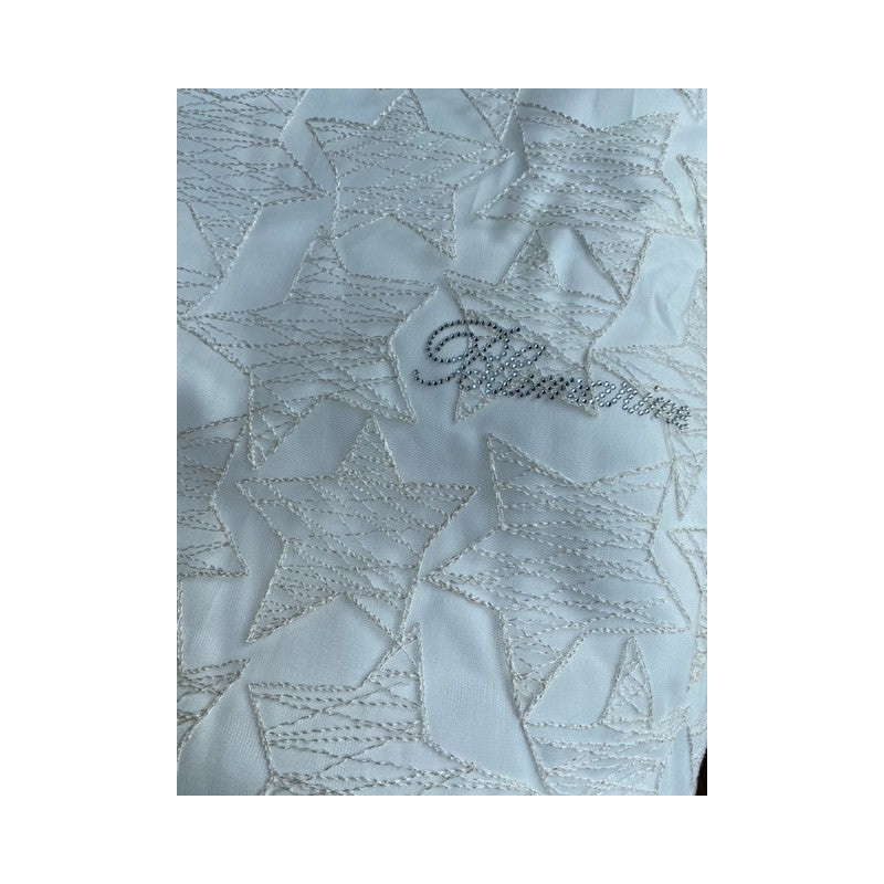 Copertina imbottita per culla e carrozzina con stelle ricamate su tulle, volant e logo Blumarine in cristalli Swarovski, retro in raso di cotone tinta unita.