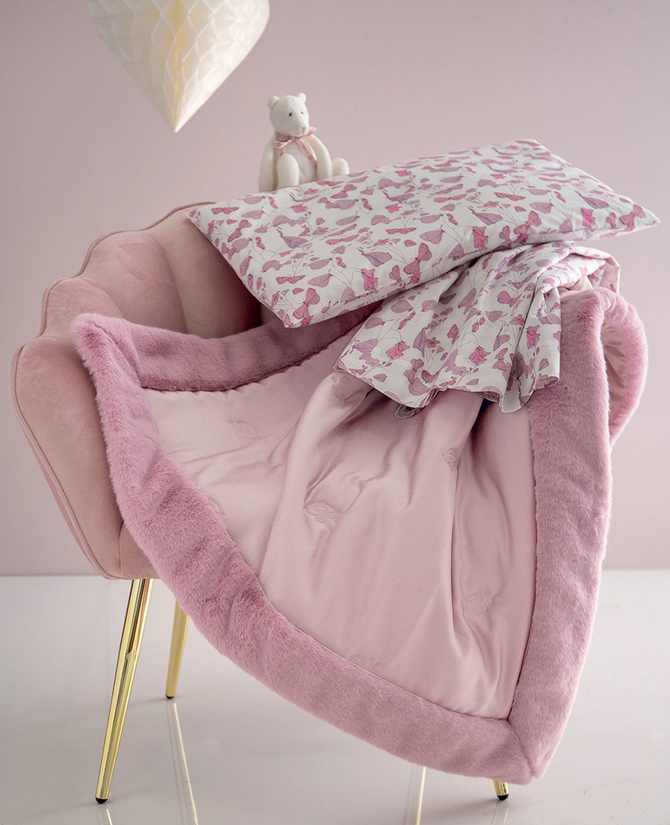 Elegante copriletto trapuntato per lettino in taffetà tinta unita con bordo in pelliccia sintetica su tre lati.
