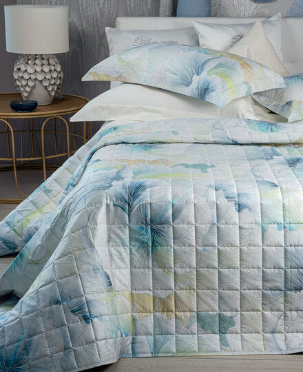 Copriletto matrimoniale trapuntato stampato all-over in raso con logo Blumarine stampato nella trama.