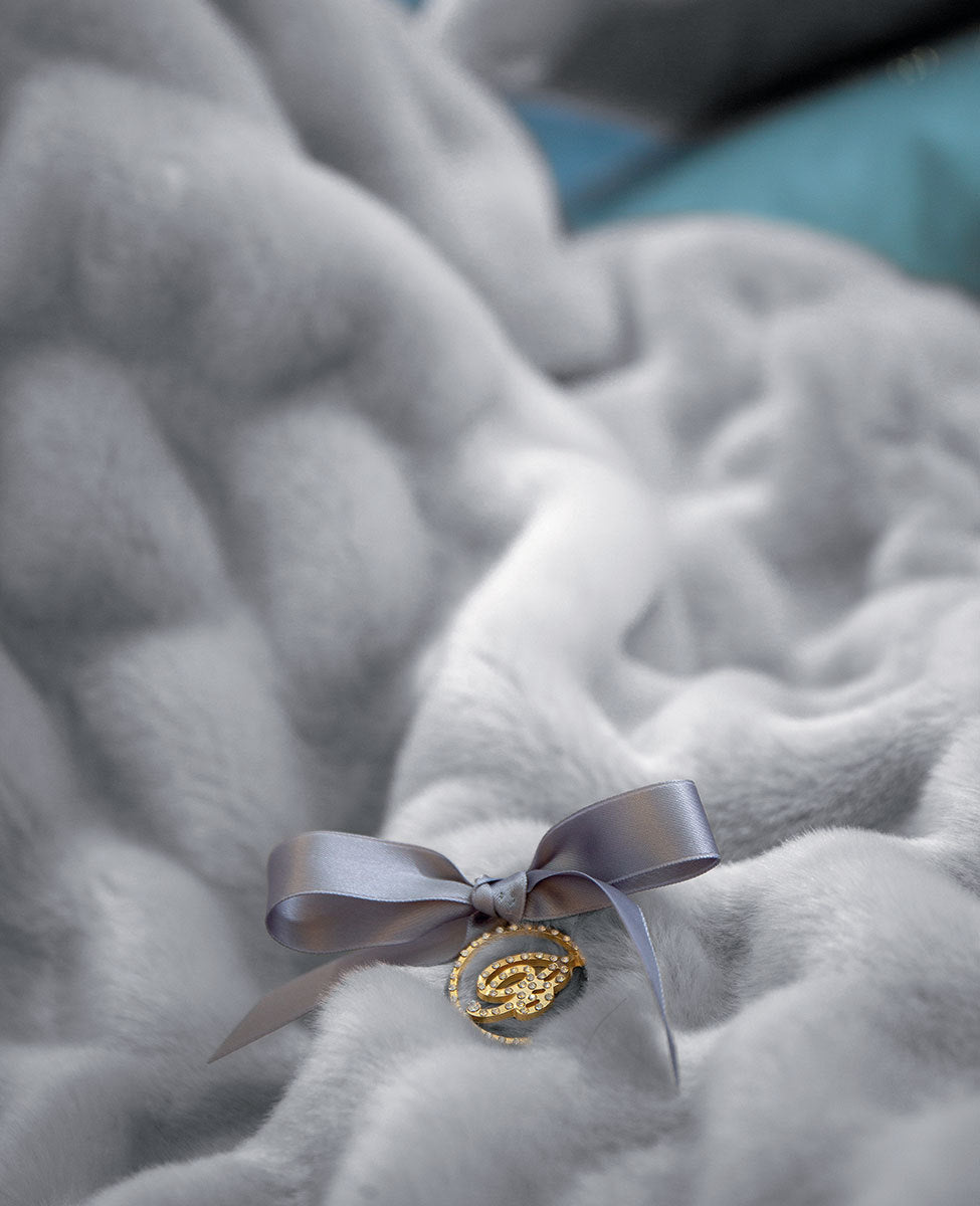 Caldo e morbidissimo copriletto matrimoniale in pelliccia sintetica con pendente Blumarine in cristalli.