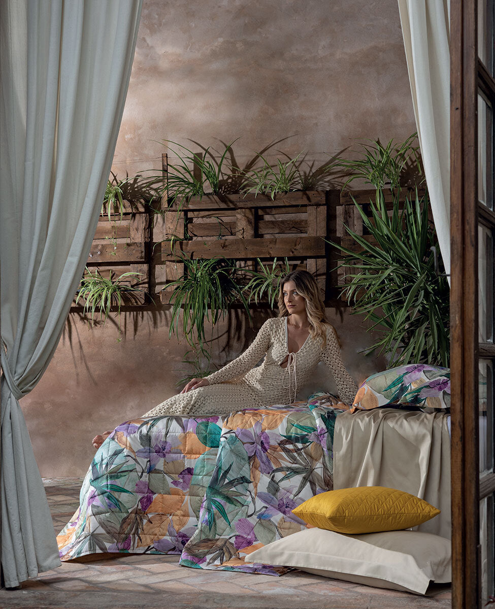 Fresco copriletto matrimoniale trapuntato con fantasia tropicale su raso di cotone.