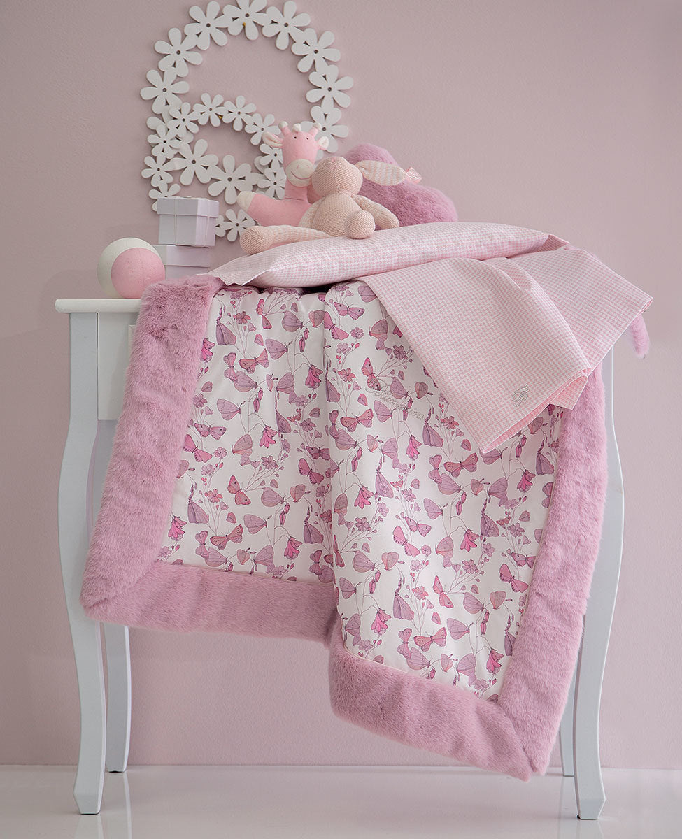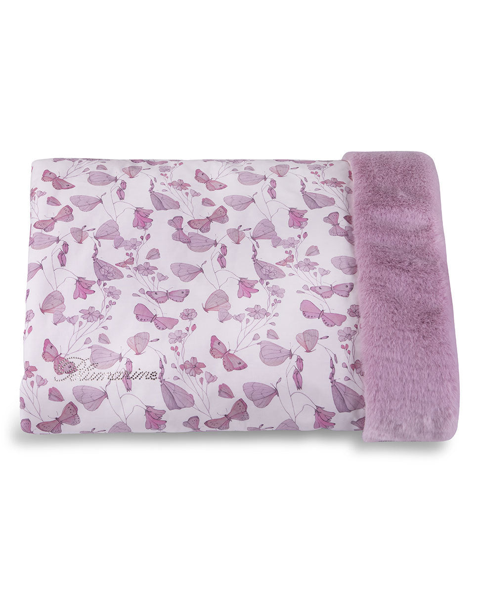 Copriletto per lettino con bordo in morbidissima pelliccia sintetica su tre lati e logo Blumarine in cristalli.