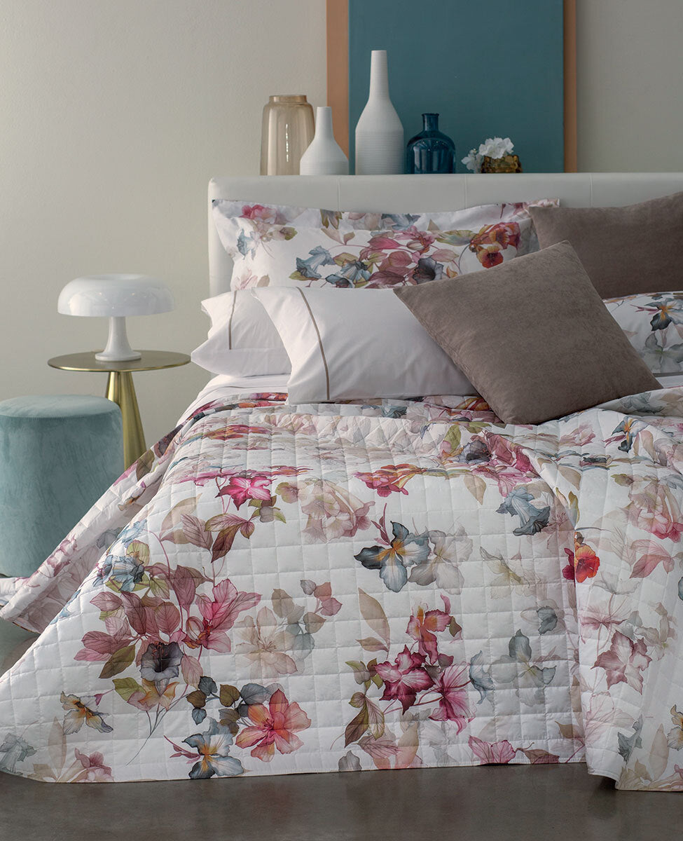 Fresco copriletto trapuntato per letto singolo in percalle di cotone stampato.