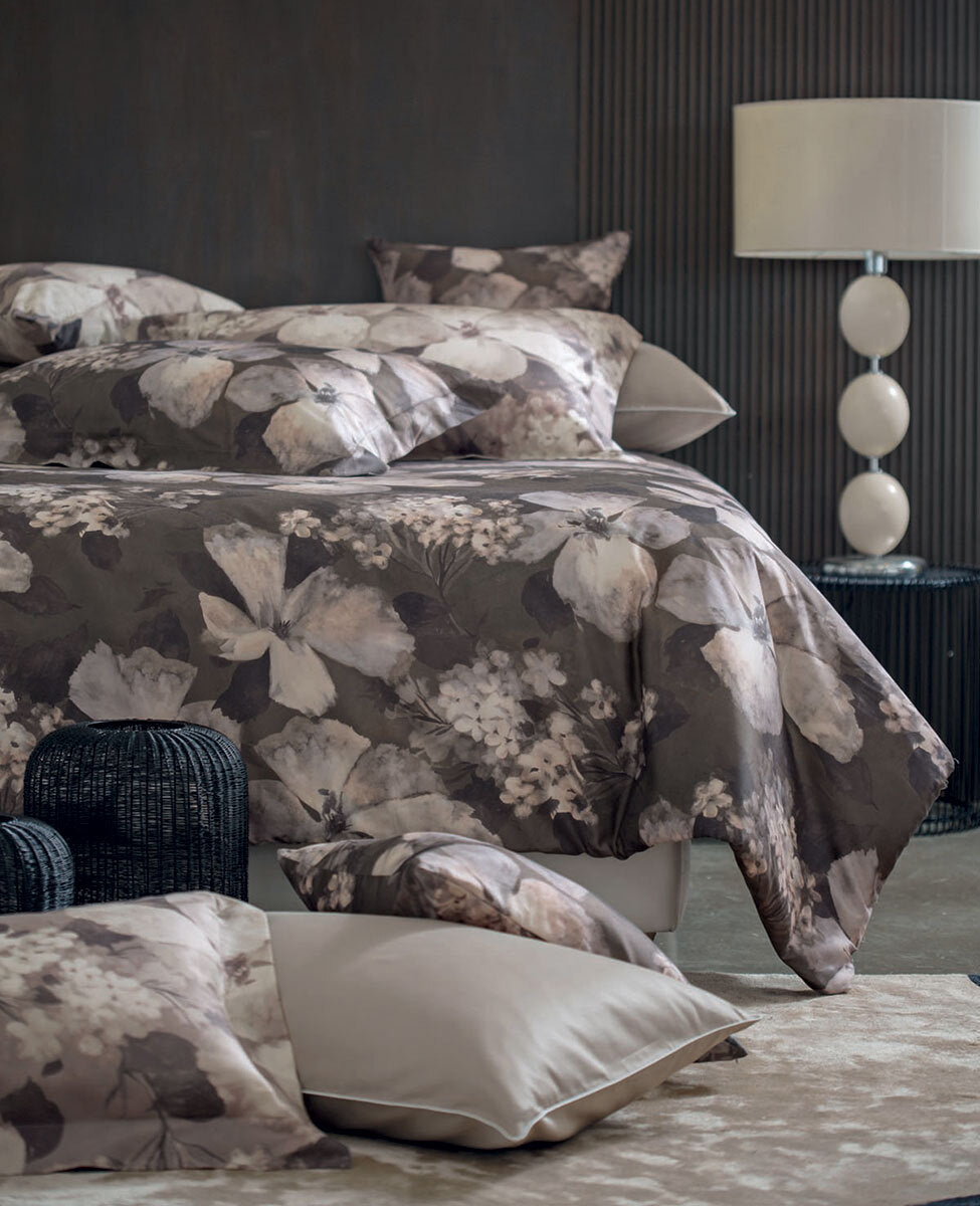 Completo copripiumino matrimoniale 4 pz in raso di cotone stampato, sottosacca e lenzuolo sotto in raso tinta unita.