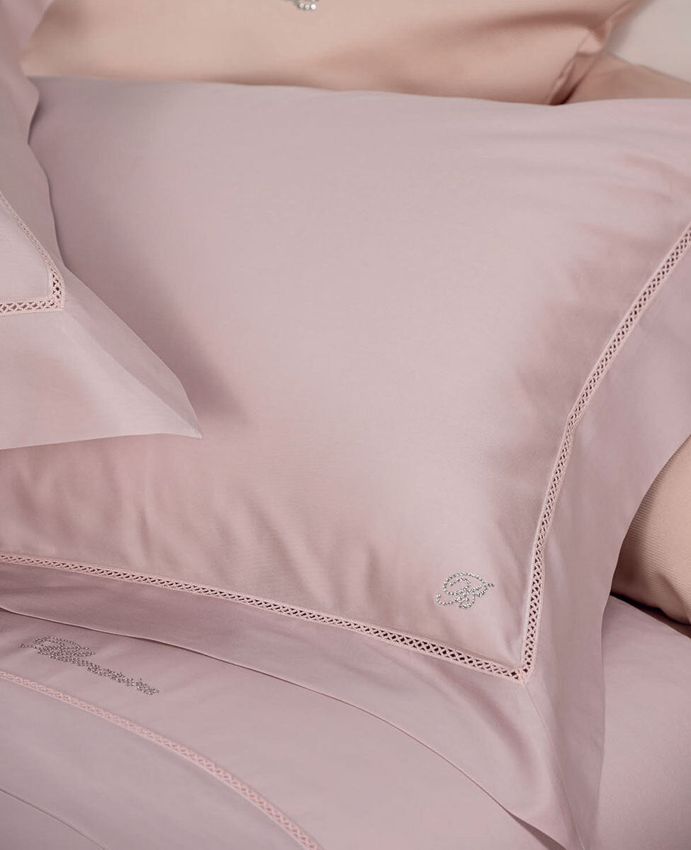 Raffinato completo copripiumino matrimoniale 4 pezzi, con finitura a croquette e logo Blumarine in cristalli Swarovski su sacca e federe.