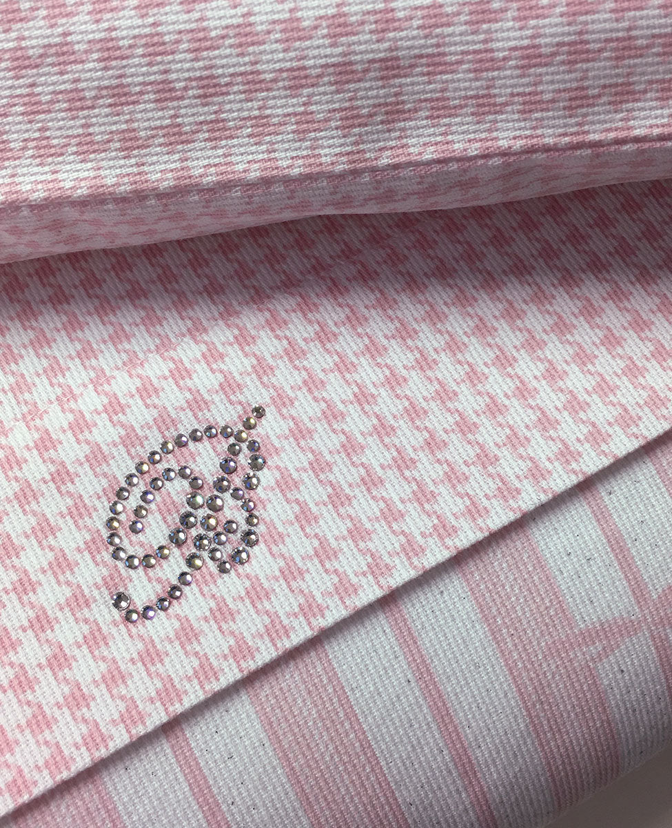 - sacca 70x85 cm stampata a righe, con fascia superiore in pied de poule e logo in cristalli, sottosacca in percalle tinta unita