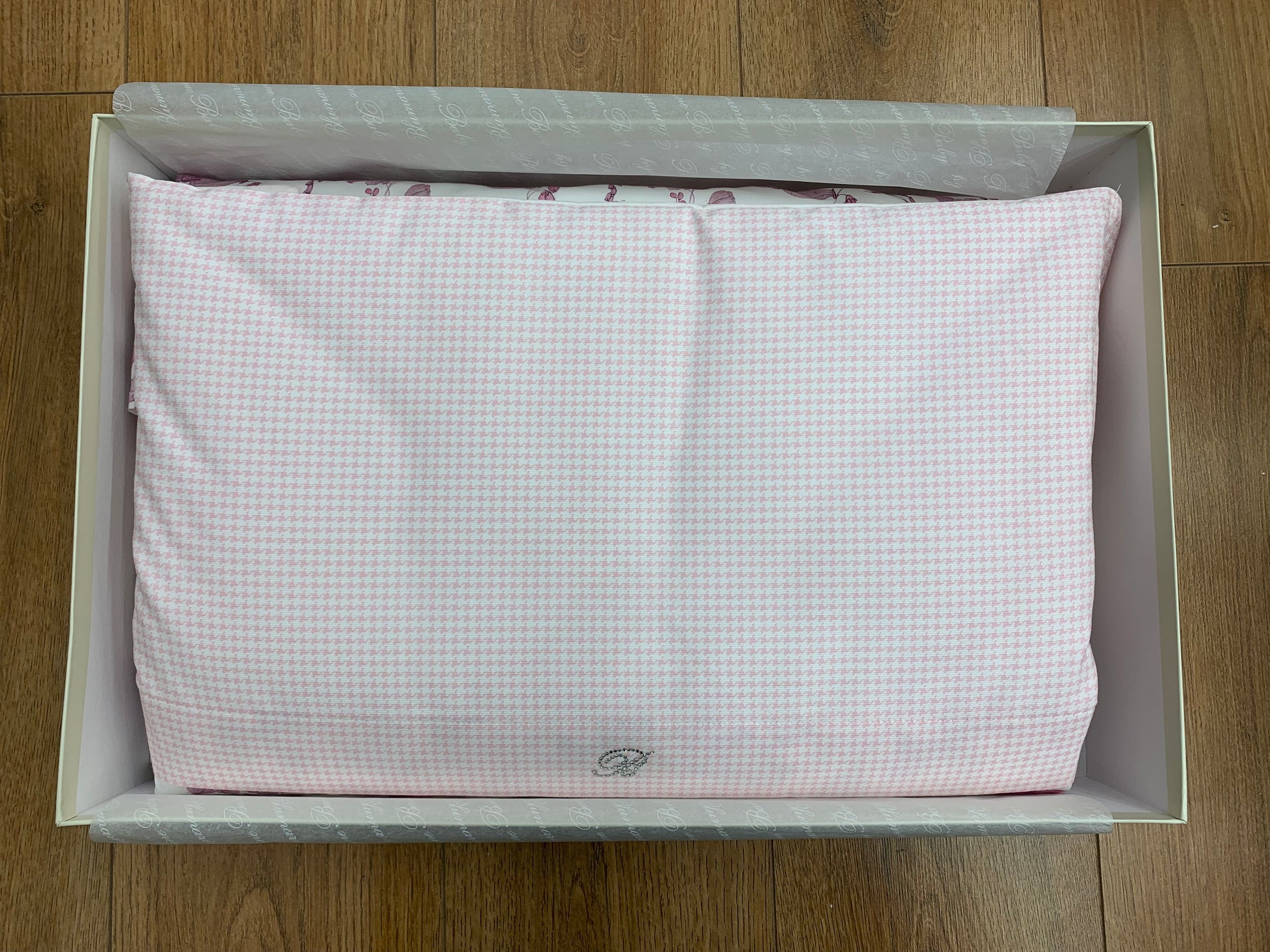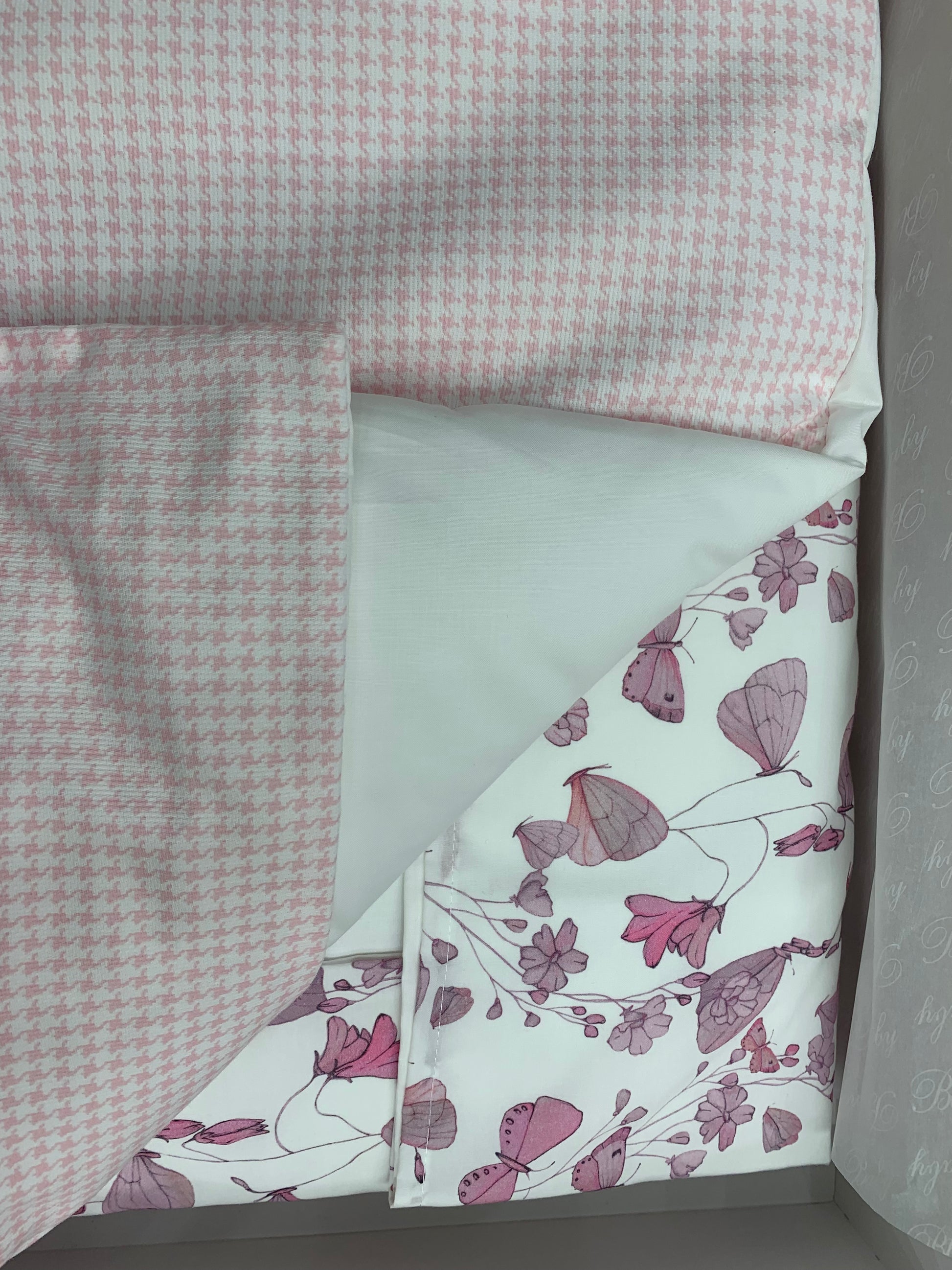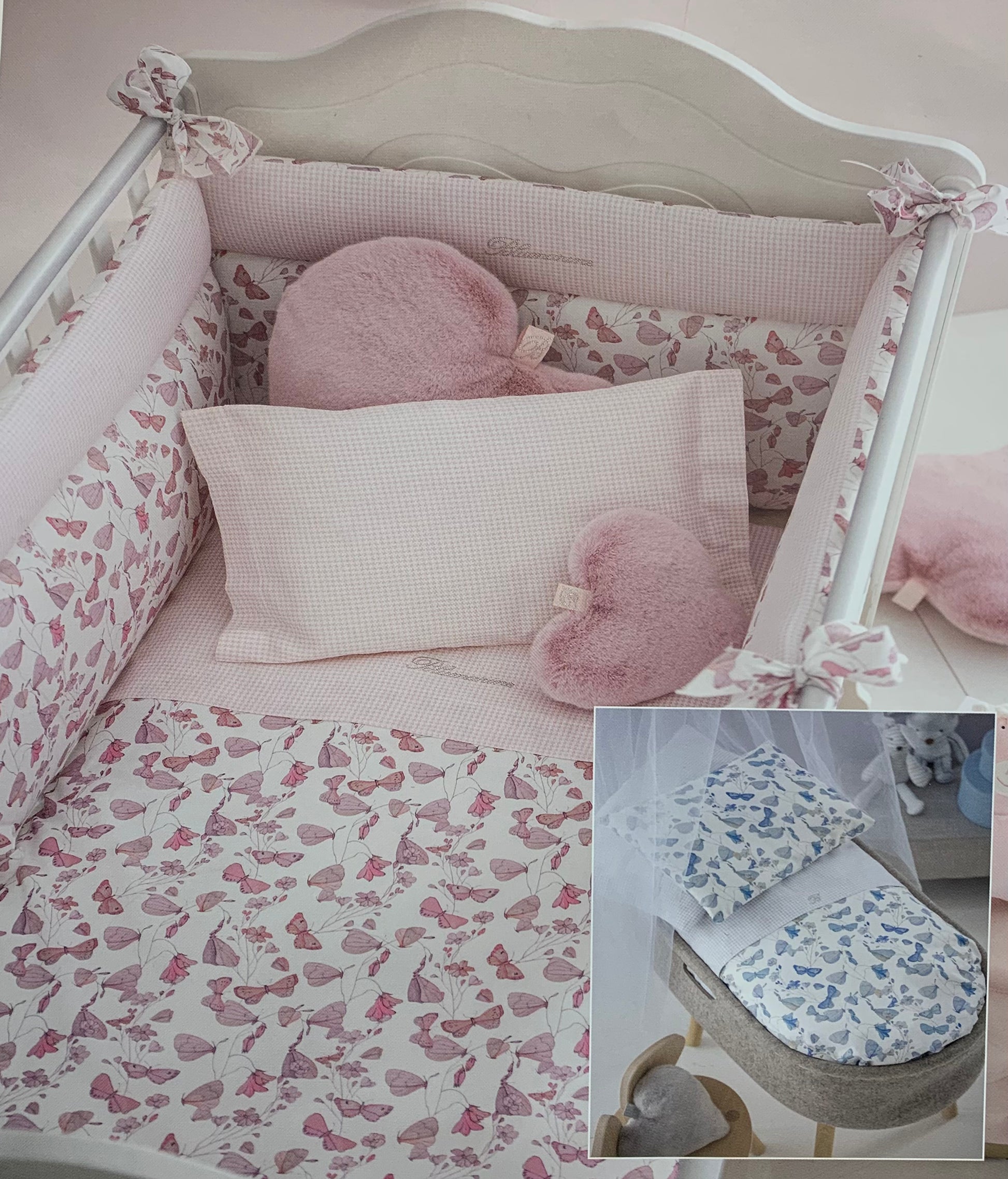 Completo copripiumino per culla con delicata stampa di fiori e farfalle su percalle di cotone e monogramma Blumarine in cristalli.