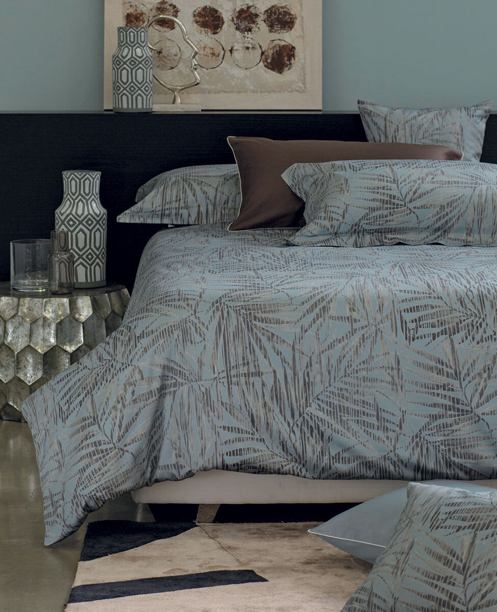 Completo copripiumino matrimoniale in raso di cotone stampato, sottosacca e lenzuolo sotto in raso tinta unita.
