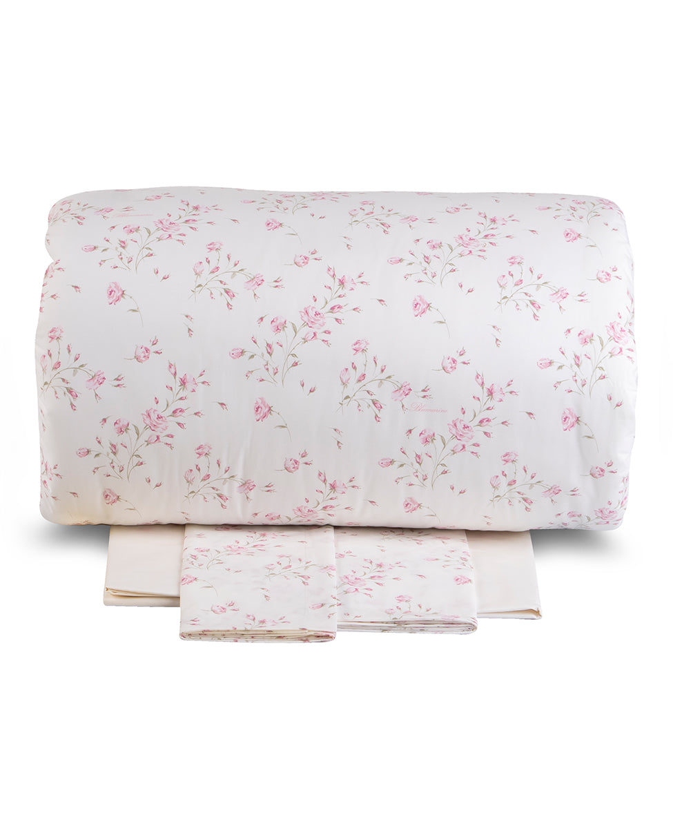 Completo copripiumino con fresca stampa all over in delicati toni pastello su federa a 4 volani e sopra sacca copripiumino, lenzuolo sotto in percalle di cotone tinta unita, logo Blumarine stampato nella trama.