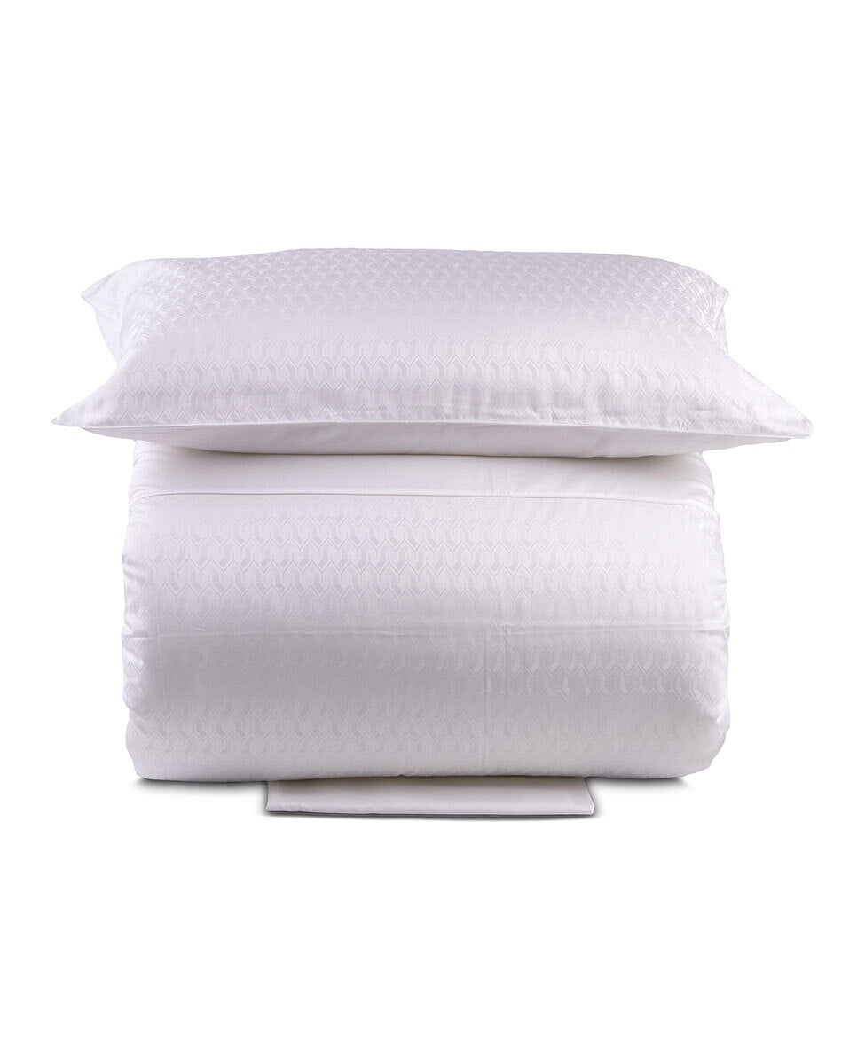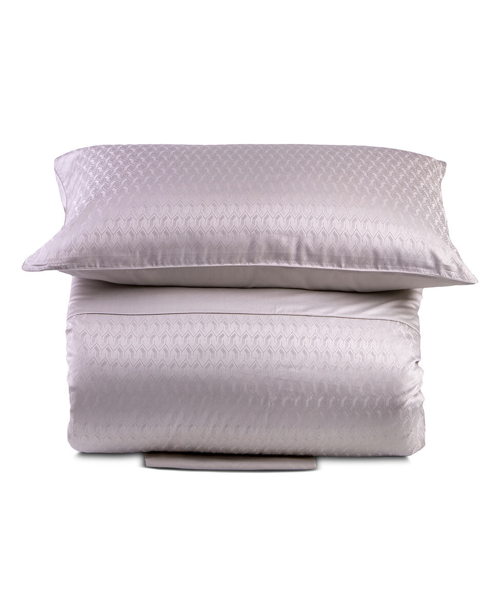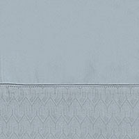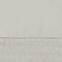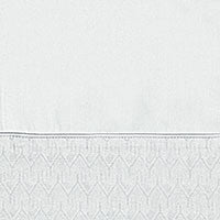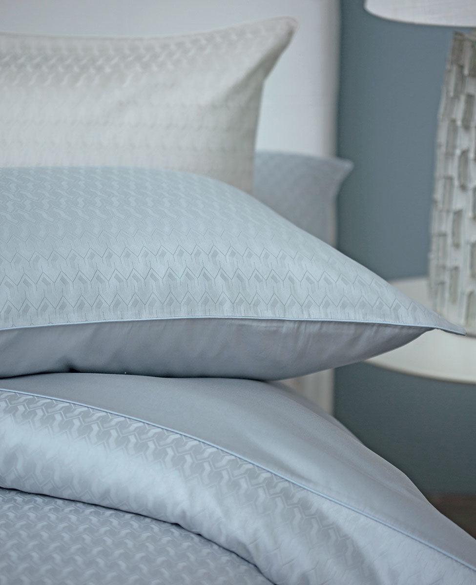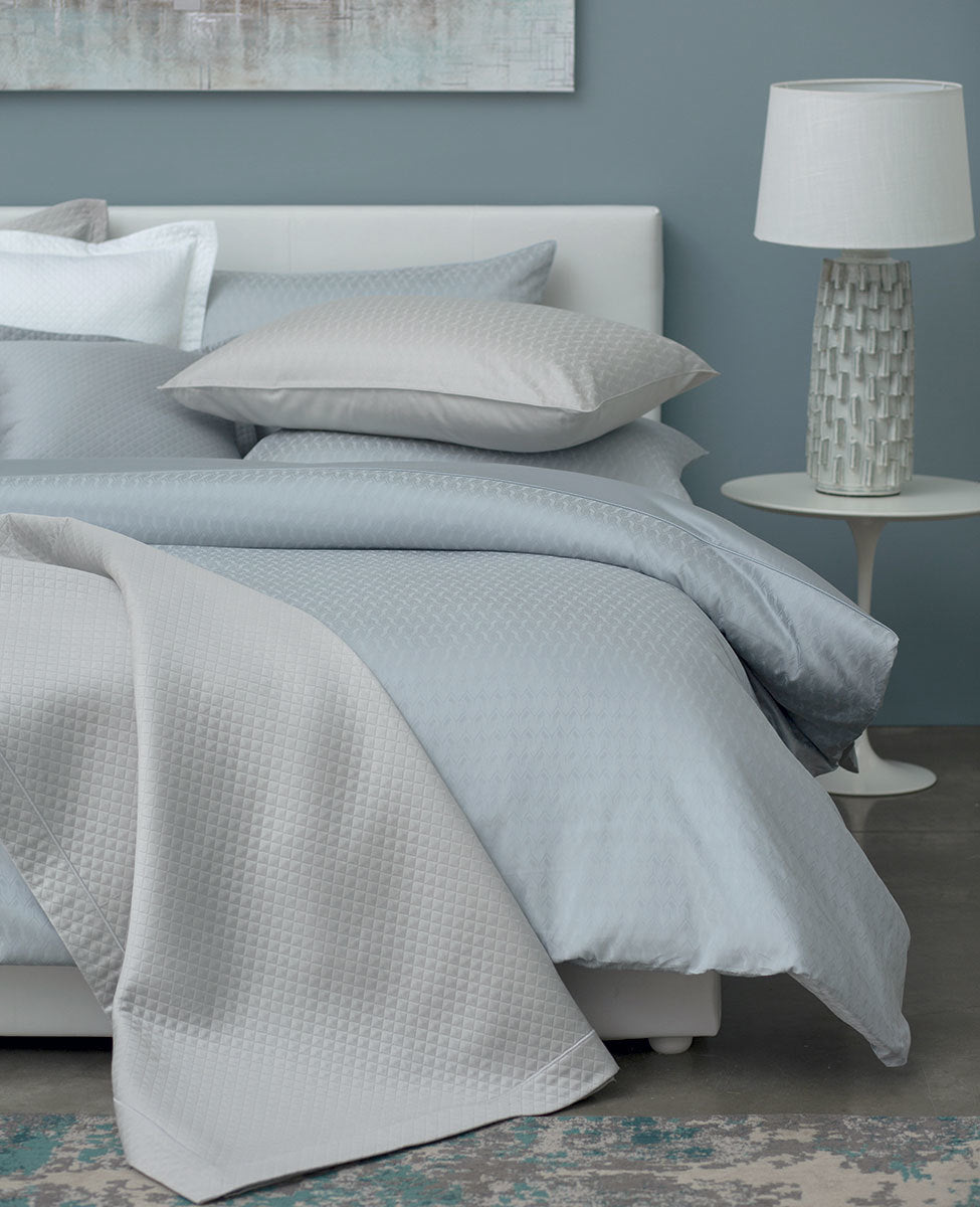 Completo copripiumino matrimoniale in jacquard di cotone rifinito con coda di topo tono su tono, sacca copripiumino con balza tinta unita, federe a sacchetto rifinite con coda di topo e retro tinta unita.