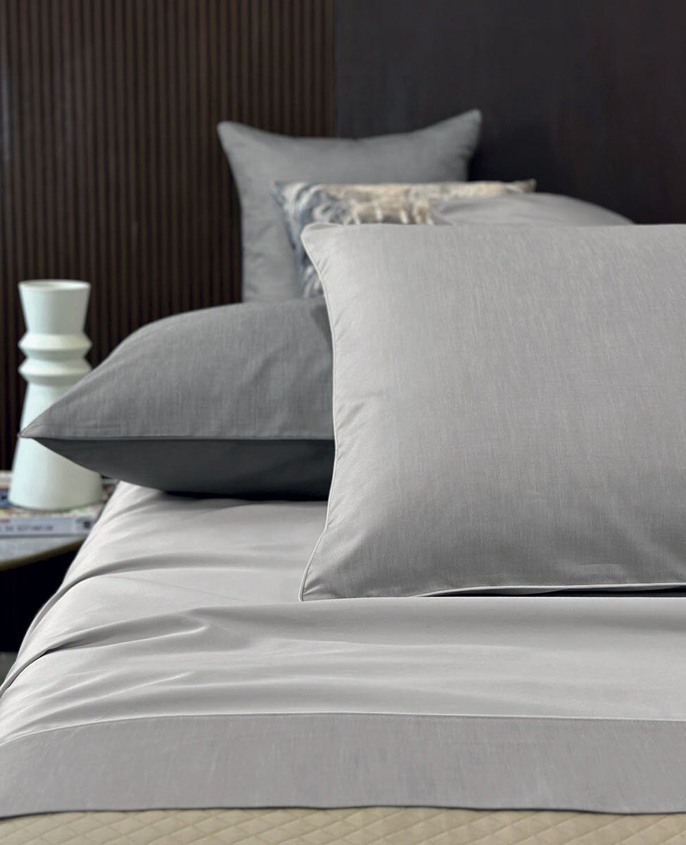 Completo lenzuola matrimoniale in jacquard di cotone rifinito con coda di topo tono su tono, lenzuolo sopra tinta unita con bordo applicato jacquard, federe a sacchetto rifinite con coda di topo e retro tinta unita.