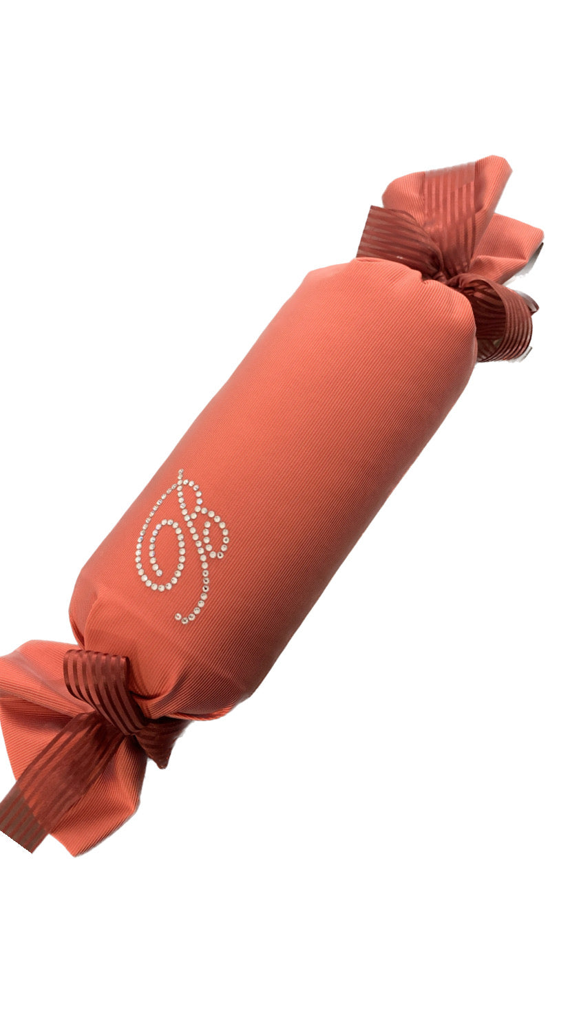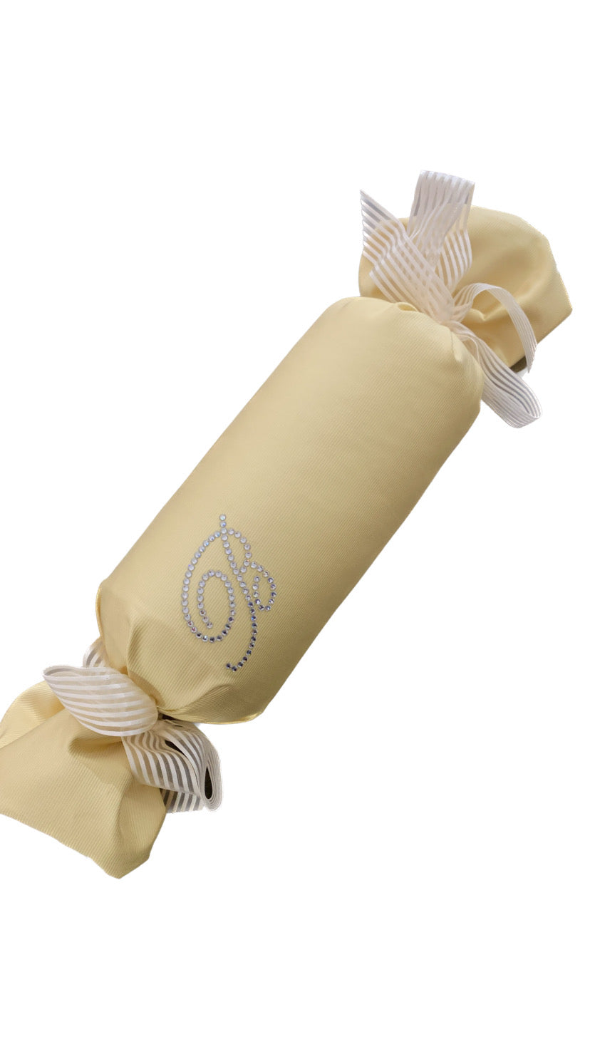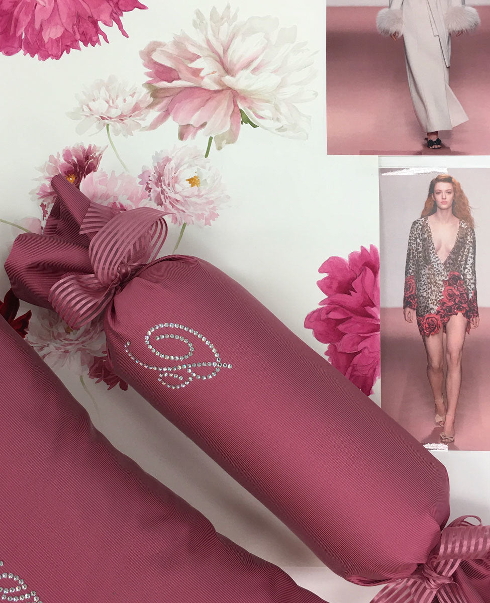 Caramella decorativa in tessuto Ottoman in tinta unita con monogramma Blumarine in cristalli Swarovski.