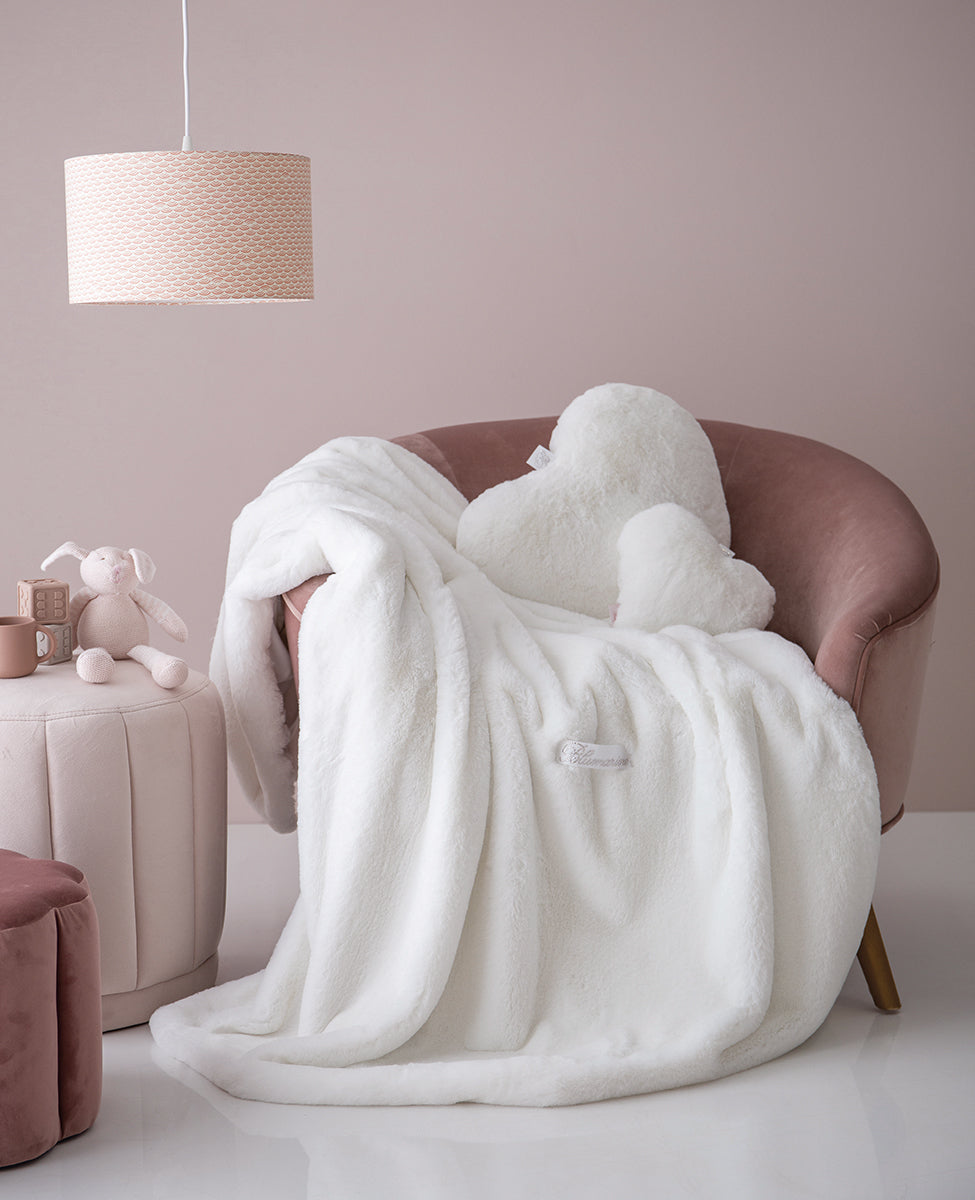 Plaid per lettino in morbidissima pelliccia sintetica con logo Blumarine in cristalli su nastrino canetè e retro in velluto tinta unita.