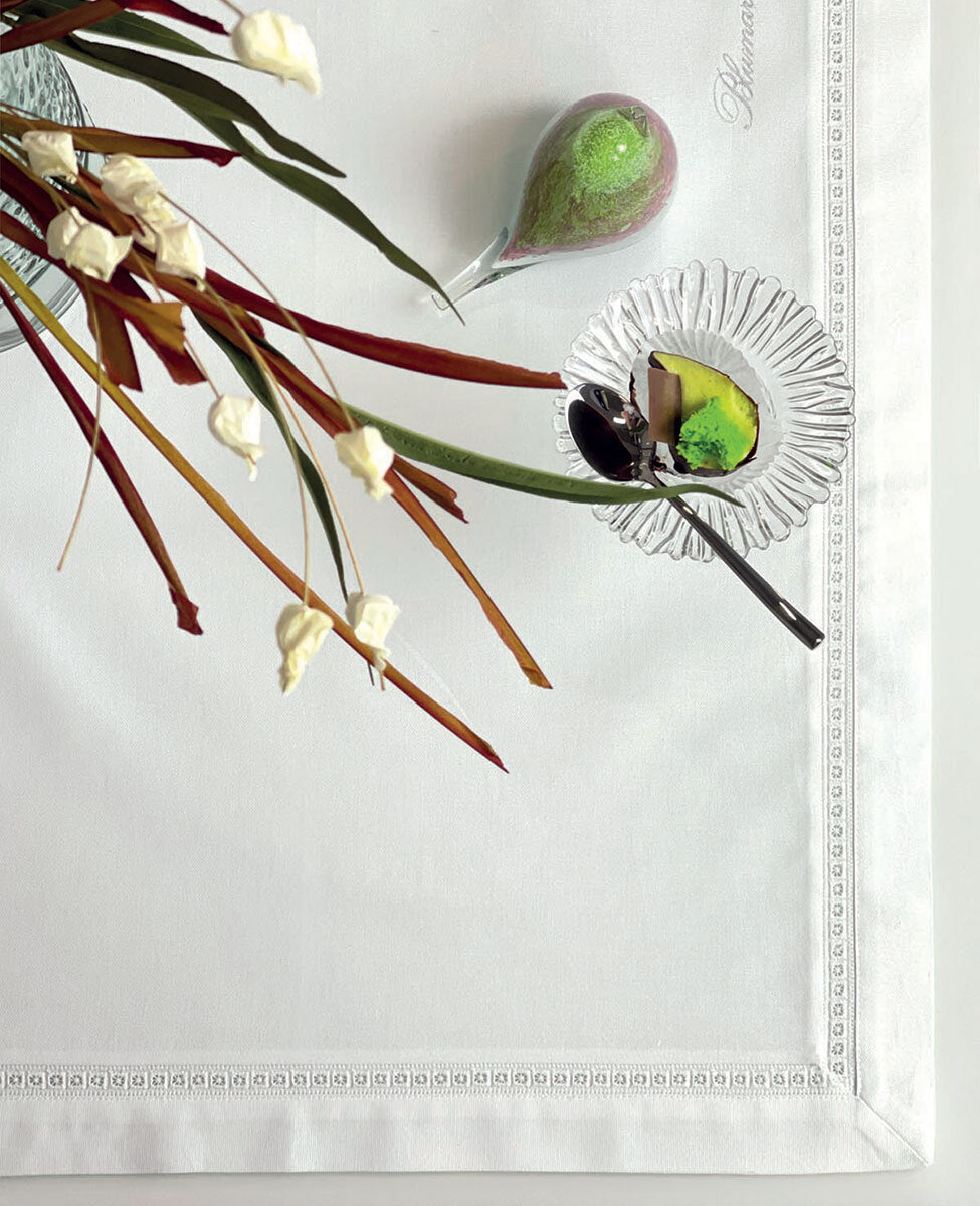 Runner tinta unita in misto cotone rifinita con piccolo punto a quadro traforato e logo Blumarine ricamato.
