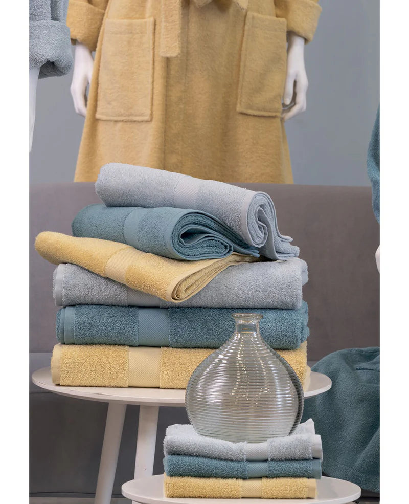 Coppia 1+1 di asciugamani in spugna di cotone idrofilo tinta unita con bordo strabattuto.