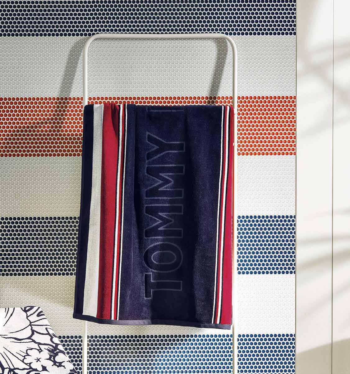 Sfondo blu navy con scritta "TOMMY HILFIGER" in rilievo e nastro jacquard.