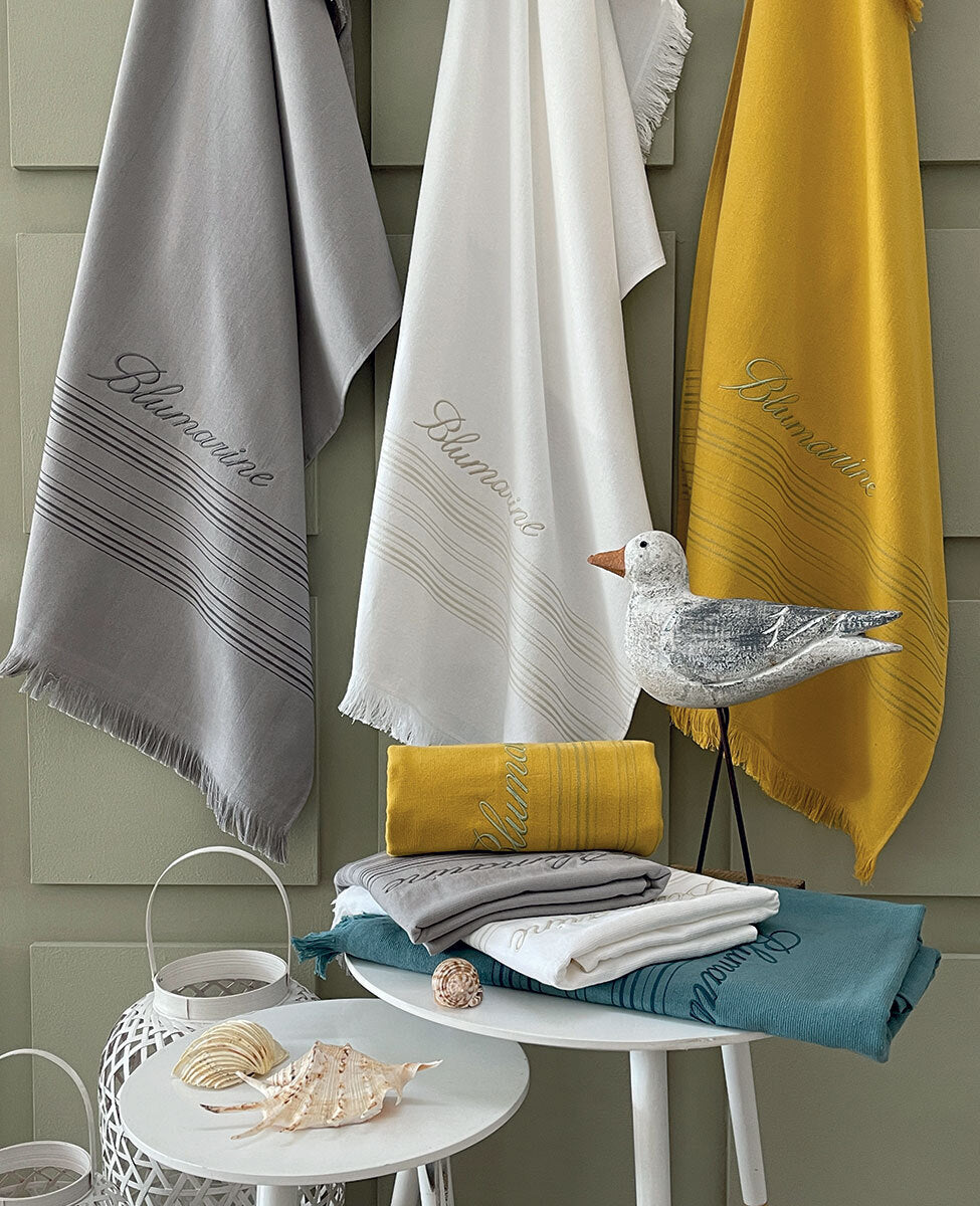Il Telo Mare Portorico è realizzato in puro cotone tinta unita, con doppie righe orizzontali in tinto in filo e logo Blumarine cesellato.