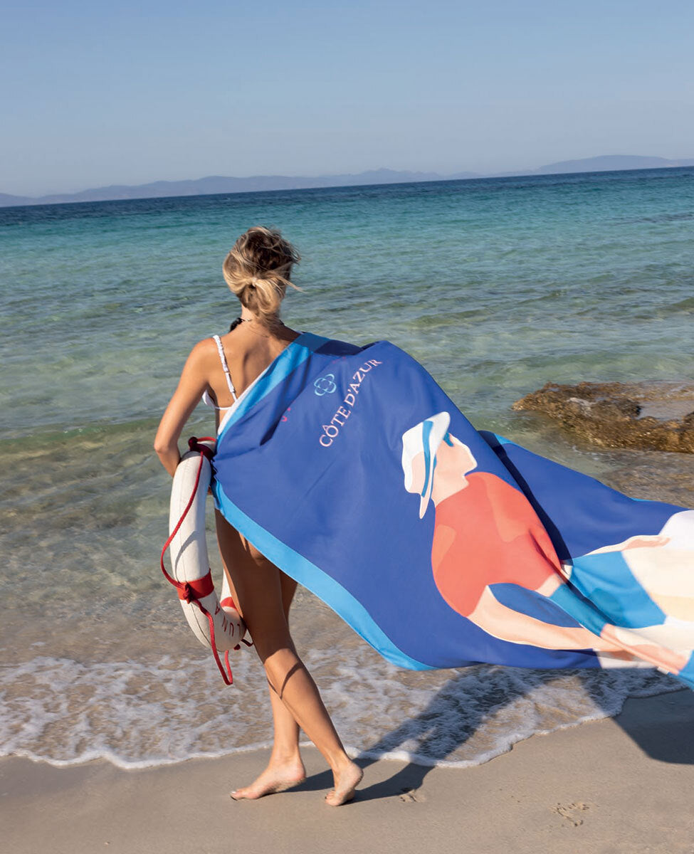 Telo mare in microfibra stampata con pochette coordinata, retro stampato con pattern logato all over.