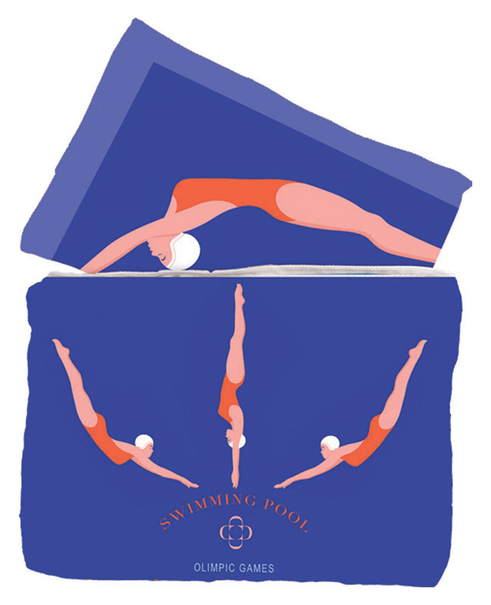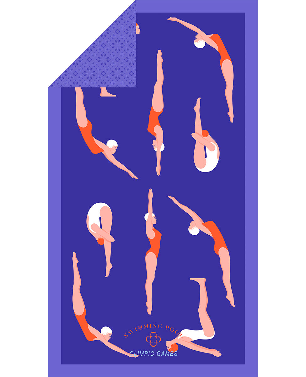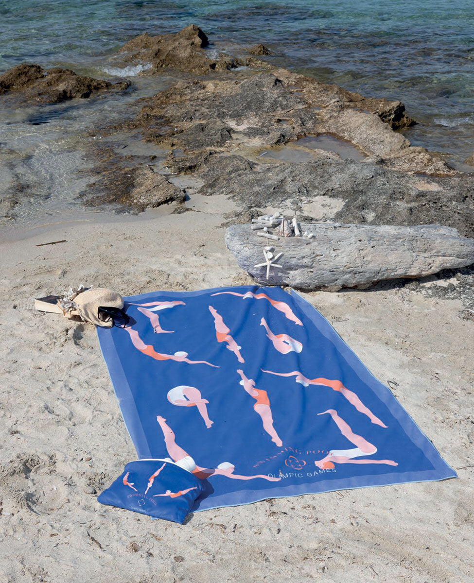 Telo mare in microfibra stampata con pochette coordinata, retro stampato con pattern logato all over.