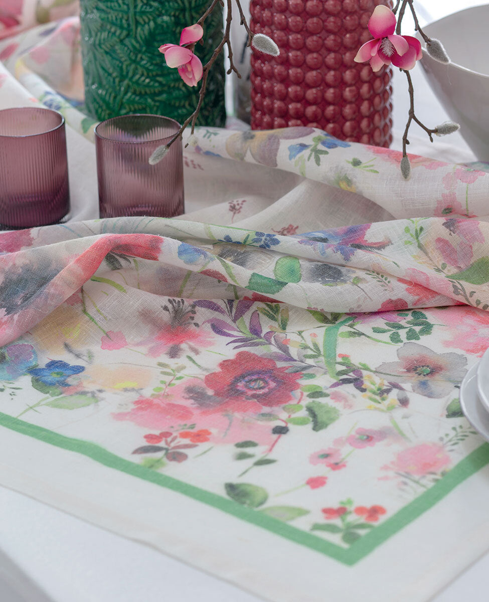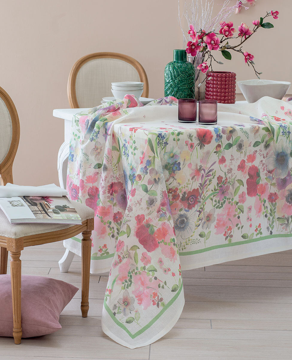 Tovaglia per 6/8 posti in cotone fiammato con stampa piazzata.