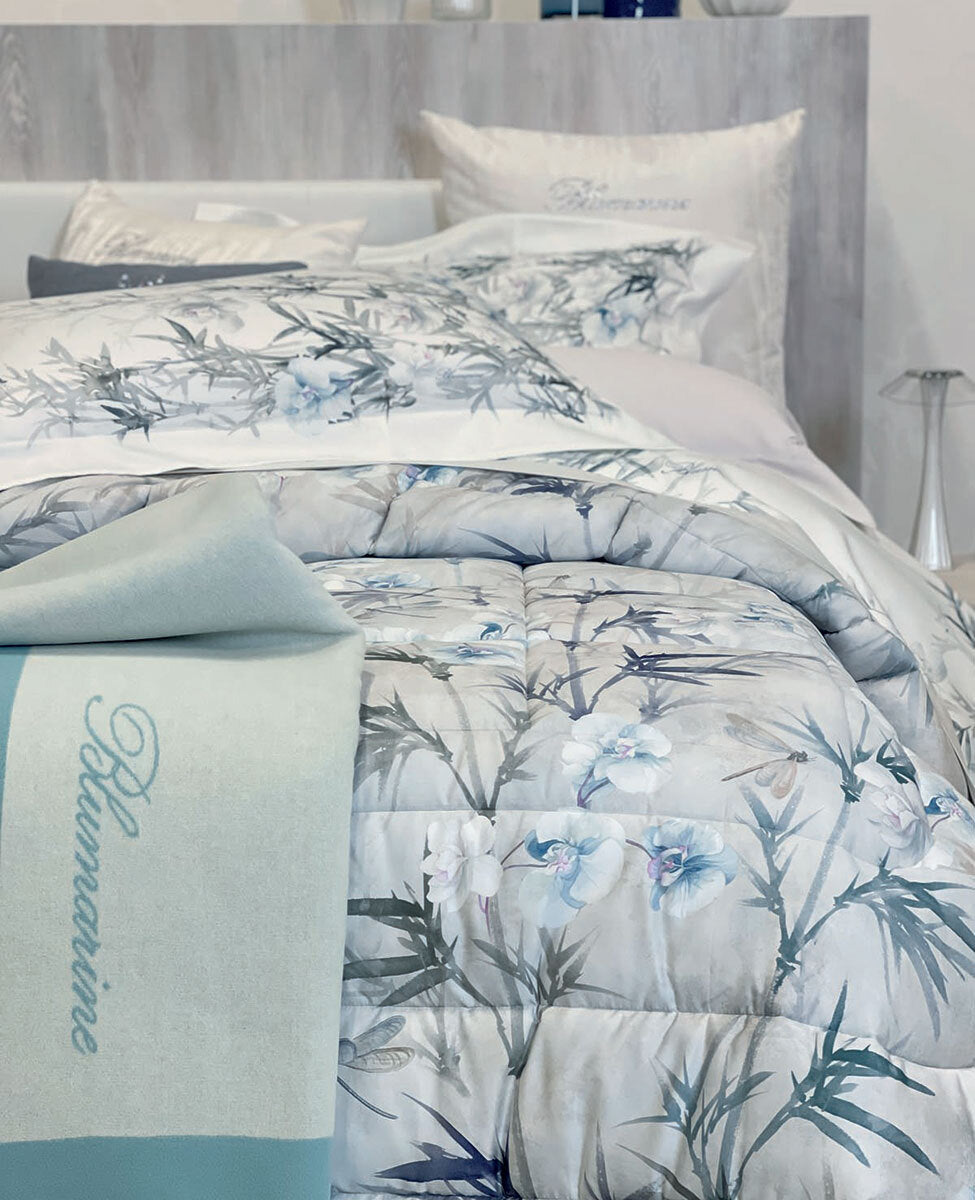 Trapunta matrimoniale con stampa all-over su raso di cotone e logo Blumarine stampato nella trama.